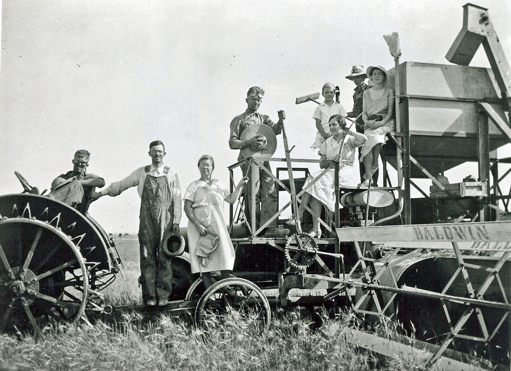 ภาพซ้าย: ไคลด์ ทอมบอ (คนที่สองจากซ้าย) ในช่วงฤดูเก็บเกี่ยวที่ฟาร์มของครอบครัวในปี 1935