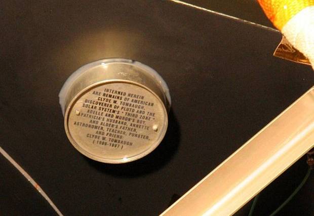 "สิ่งที่อยู่ภายในคือส่วนหนึ่งของไคลด์ ดับเบิลยู. ทอมบอ ชาวอเมริกันผู้ค้นพบดาวพลูโตและเขตแดนที่สามของระบบสุริยะ เด็กชายตัวน้อย ๆ ของอะเดลและมูรอน สามีของแพทริเซีย บิดาของแอนเน็ตและอัลเดน นักดาราศาสตร์ อาจารย์ เจ้าสำบัดสำนวน และเพื่อน: ไคลด์ ดับเบิลยู. ทอมบอ (1906-1997)"