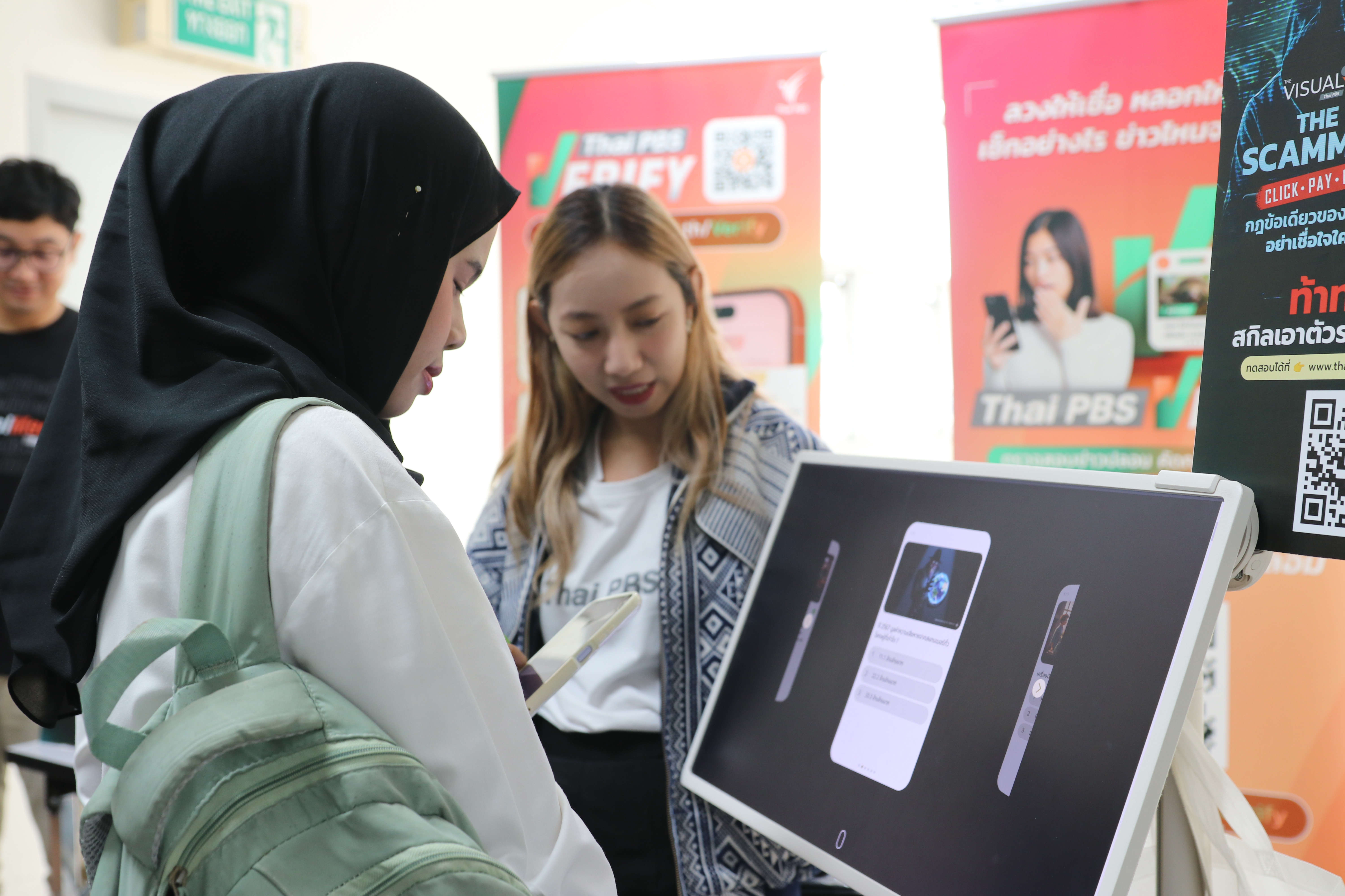 Thai PBS Verify ร่วมจัดบูธ พร้อมเปิดตัวผลงานใหม่ล่าสุดอย่าง "THE SCAMMER CLICK • PAY • CRY : กฎข้อเดียวของเกมนี้ = อย่าเชื่อใจใคร" ที่นำเสนอเรื่องราวของภัยมิจฉาชีพผ่าน Data Visualization ที่เข้าใจง่าย พร้อมเกมจำลองสถานการณ์ให้ได้ทดสอบทักษะการเอาตัวรอด