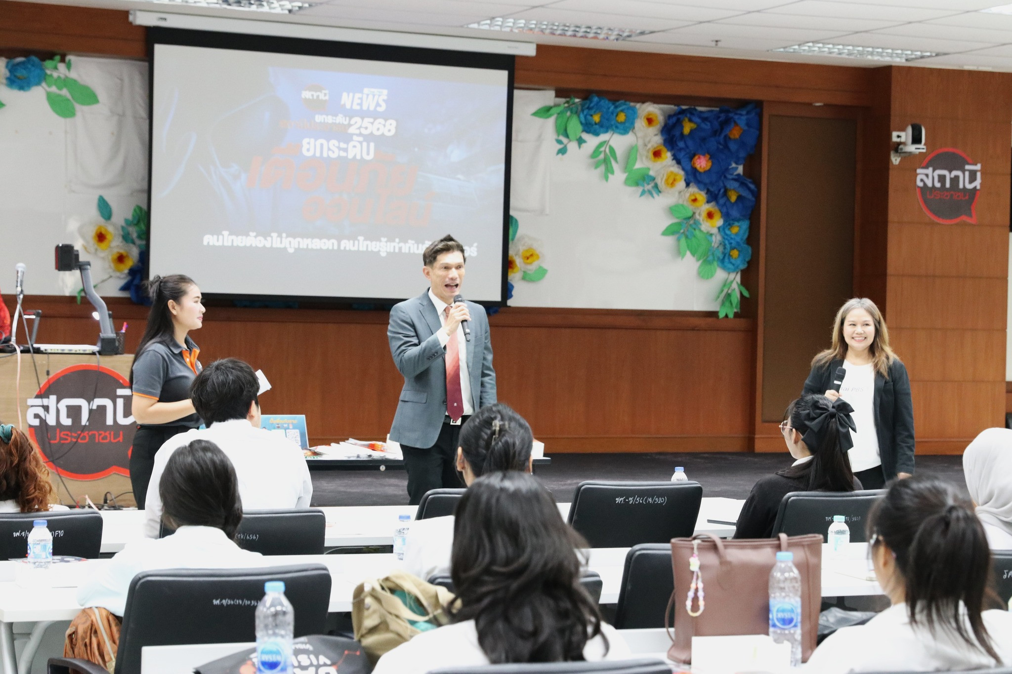 เมื่อวันที่ 25 ก.ย.68 ที่ผ่านมา ทีมงานไทยพีบีเอส ประกอบด้วย รายการสถานีประชาชน, รายการภูมิคุ้มกัน ไทยพีบีเอสพอดแคสต์, Thai PBS Verify สำนักสื่อดิจิทัล และศูนย์สื่อสารและส่งเสริมการตลาดเพื่อสาธารณะ ร่วมออกบูธและจัดบรรยายใน “โครงการยกระดับเตือนภัยออนไลน์ สร้างเครือข่ายนักศึกษาให้รู้เท่าทันภัยไซเบอร์” โดยผนึกกำลังกับตำรวจสอบสวนกลาง (CIB) ลงพื้นที่บรรยายให้ความรู้ที่มหาวิทยาลัยรามคำแหง เพราะจากสถิติการแจ้งความออนไลน์ในช่วงกว่า 3 ปีที่ผ่านมา ยอดสูงกว่า 1,000,000 คดี ความเสียหายกว่า 97,000 ล้านบาท โดยมีแนวโน้มที่จะเพิ่มขึ้นอย่างต่อเนื่อง จึงต้องสร้างเครือข่ายให้ข้อมูลประชาชนเพื่อป้องกันไม่ให้ถูกหลอก