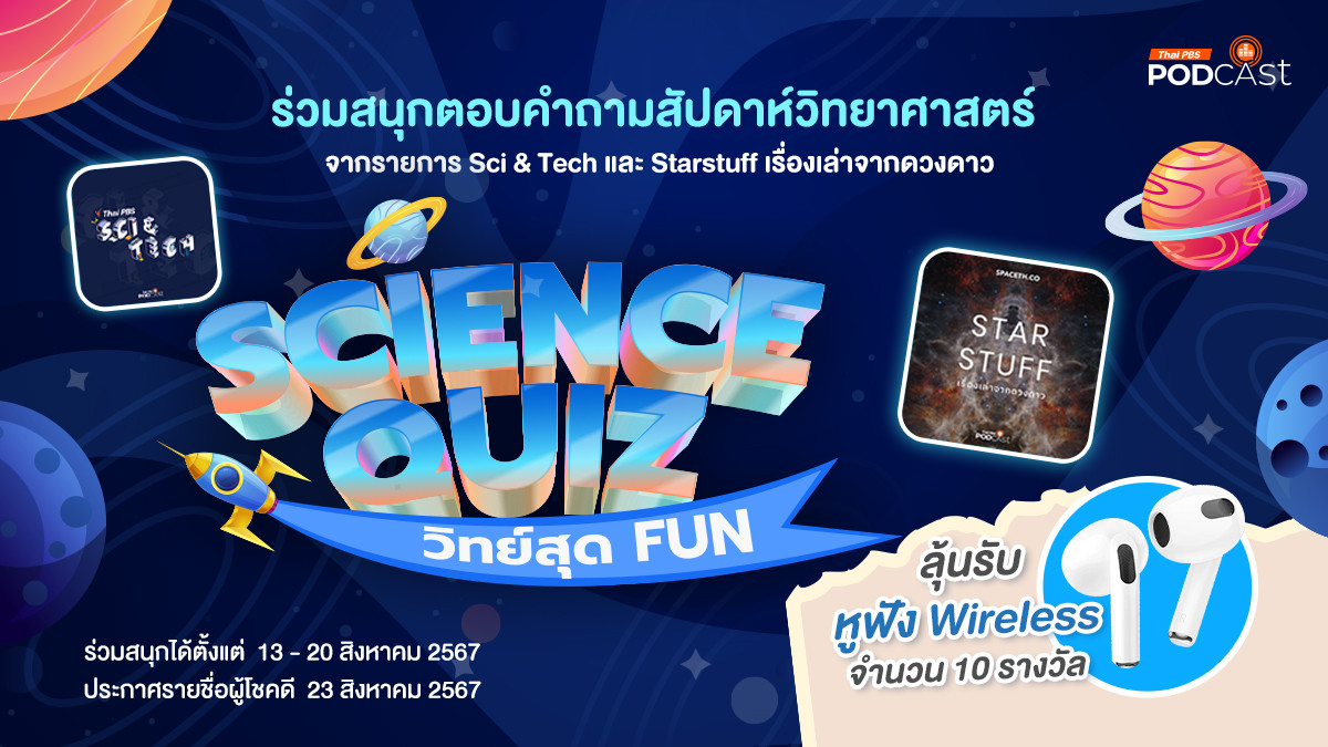 ใครที่เป็นสายวิทยาศาสตร์และเทคโนโลยี ต้องไม่พลาดกับกิจกรรมดี ๆ จาก Thai PBS Podcast กับกิจกรรม Science Quiz วิทย์สุด Fun 2024 ที่จะมาชวนผู้ฟังร่วมสนุกตอบคำถามในสัปดาห์วิทยาศาสตร์ โดยตอบคำถามจากเนื้อหาในรายการ Sci & Tech และ Star Stuff เรื่องเล่าจากดวงดาว ทาง Thai PBS Podcast